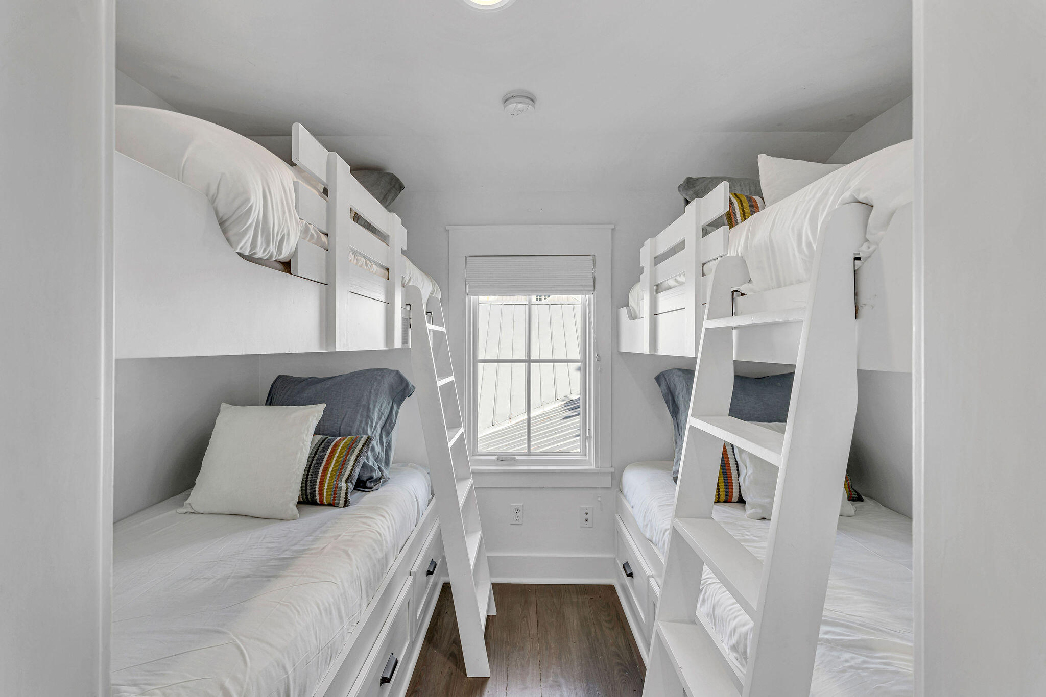 Inside, the open layout is bright and inviting, with fresh finishes and a coastal feel throughout. The spacious living area is warmed by wood floors and natural light, while the chef-inspired kitchen is equipped with high-end appliances, a large center island, and custom cabinetry, making it perfect for hosting friends and family. The first-floor primary suite highlights coastal living with shiplap accents and barn doors leading to the closet. Upstairs, you'll find four additional bedrooms, including a built-in bunk room, all thoughtfully designed for comfort and convenience.